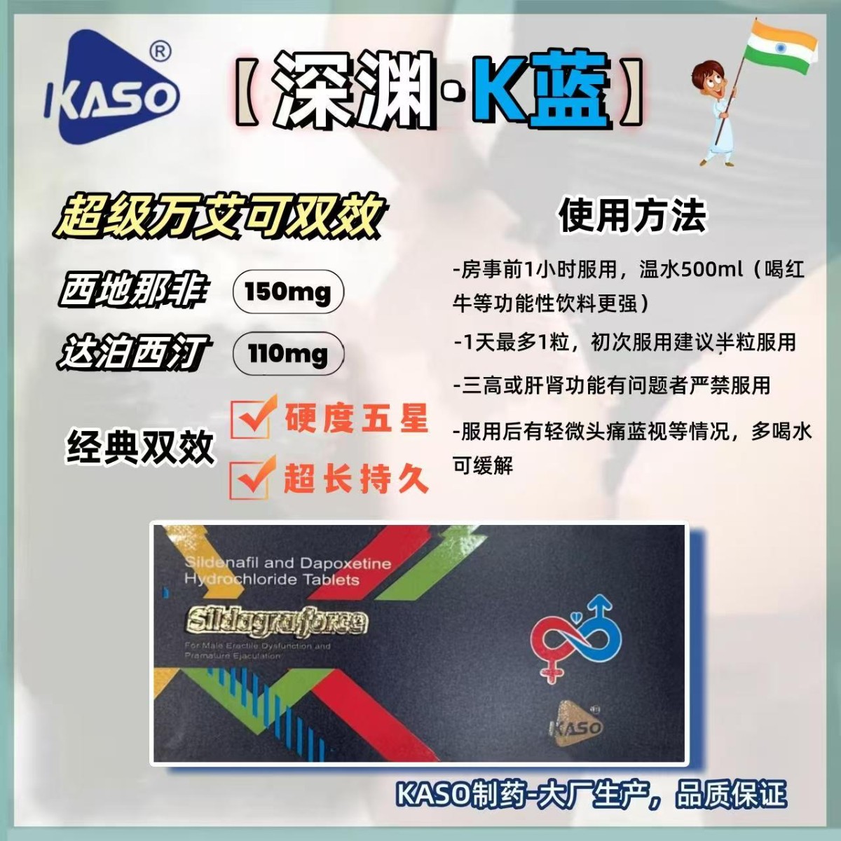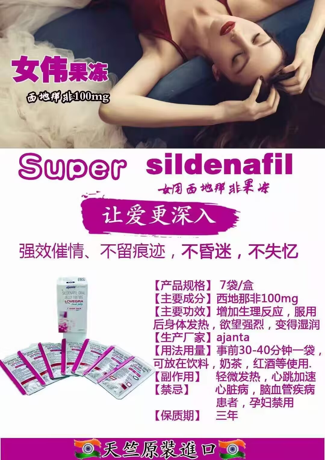本店只做印度/泰国原装进口双效片,价格是国内的5分之一左右,是国内任何药厂出的男性用药所比不了的,(而且没有任何的依赖性和副作用)!印度从2010年左右就已经是世界上男性用药生产最大的地区,本店从2018年开始代购,请大家尽管放心。
